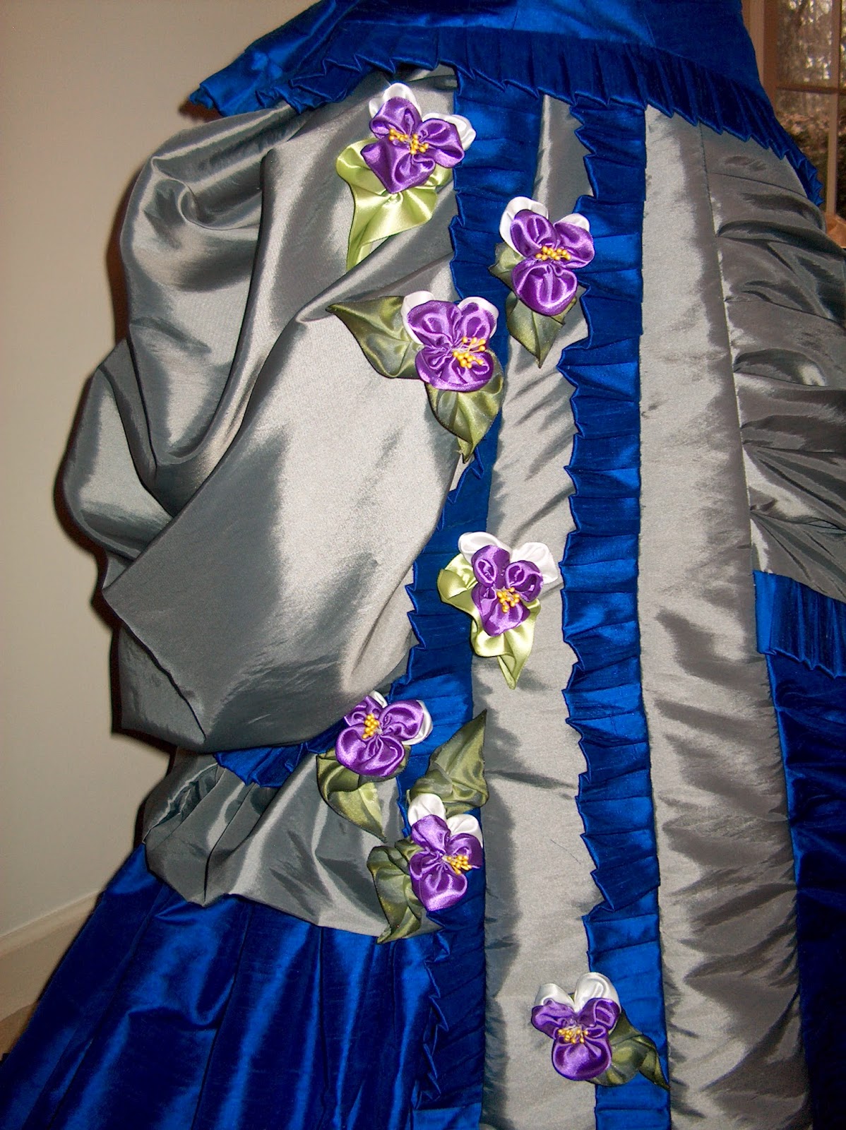 On Thursday and Friday nights I had pulled unworn costumes from the dark recesses of my closet. And I do the same for the Saturday night Gala. In December 2013 I was planning to attend and teach ribbon flower creation at a SASS Convention. The Ball theme was based on the Reconciliation of the States following the Civil War. The colors of blue and gray representing the opposing armies were my inspiration for the ballgown colors and a Harper's Bazaar fashionplate from 1872 inspired the style.