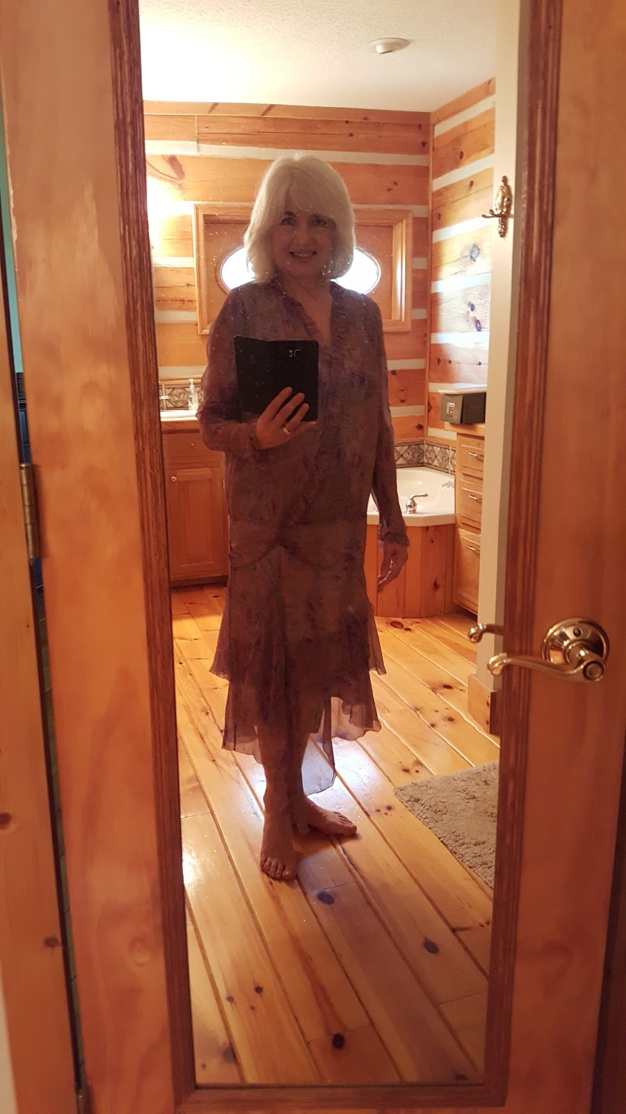 I have a sweet friend who is extraordinary when it comes to vintage costume. We have attended many events together and to my tearful pleasure she gave me a gift of a vintage chiffon day dress. This is the only photo I have of me trying it on the day it arrived.