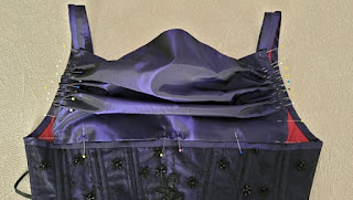 Now the back bodice panels and grommet panel are pinned to check for alignment.