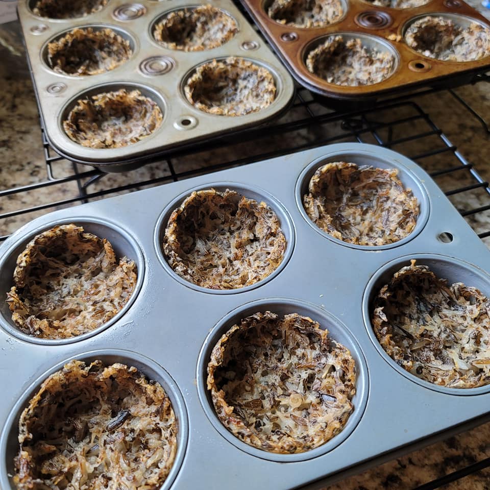 Lightly oil the bottoms and sides of muffin pans. Pat about 3 tablespoons of the mashed rice into the muffin pans on the bottom and up the sides forming a tart for filling. Bake for 25 to 40 minutes at 350 degrees until the rice is darkened in color and the sides of the shells are crisped.
