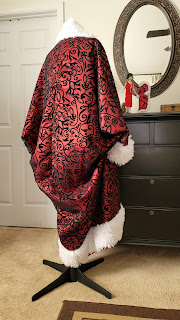 It took a while longer to find a red satin that had the heaviness to hold the weight of the overlay and faux fur and the shine and bright color to show through the black net of the overlay, but patience won out and I found a 5 yard remnant that would give the right impression. Like those fabric weights?