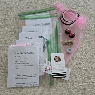 I created YouTube videos of the introduction to Ribbon Flowers and Embellishments and step-by-step videos of the Gathered Rose, Basic Leaf, Pansy and Gardenia. The students can follow the videos any time they wish using the kits I made for them. And for you I'll link the Playlist in case you want to learn this beautiful art yourself. Watch for future additions to the Playlist such as the Daffodil which I did not include in this class but will offer it in future classes.
