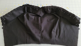 The next step in the instructions is to easestitch the upper edge. The pattern Glossary defines this as "Stitch along seamline, using long machine stitches. Pull thread ends when adjusting to fit."